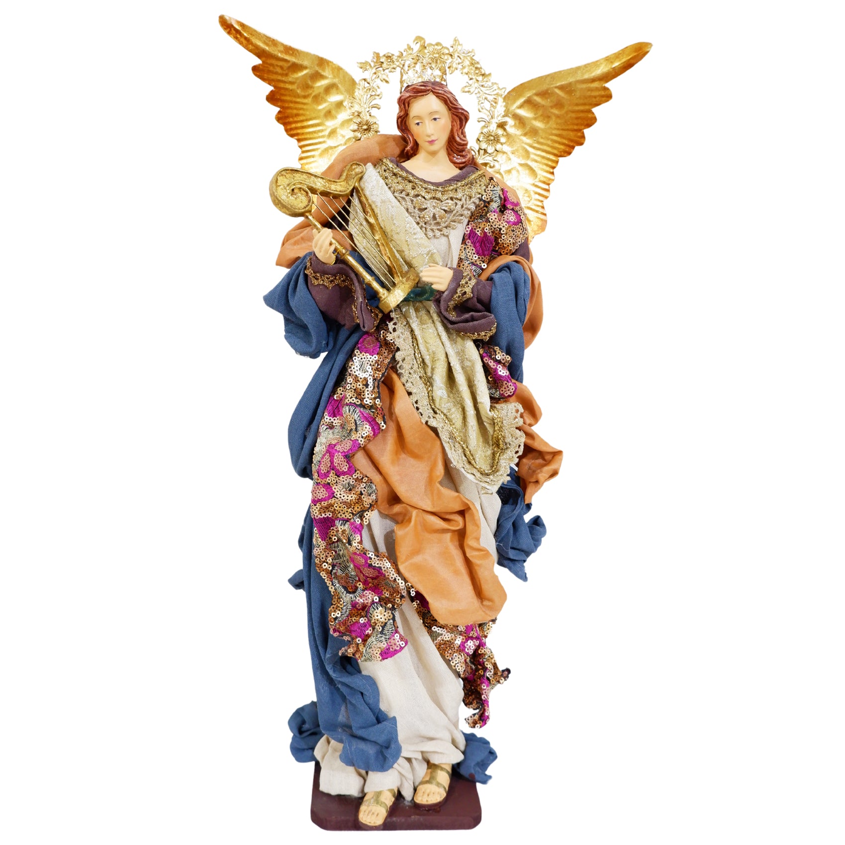 Cet ange musicien luxueux, jouant de la harpe, est inspiré de l’art italien et des santons napolitains. Reposant sur un socle brun, il est habillé d'une tenue majestueuse dont les drapés, très soignés, présentent des mouvements dynamiques. Son visage incliné, peint à la main, exprime la bienveillance. Il arbore de grandes ailes en métal doré.