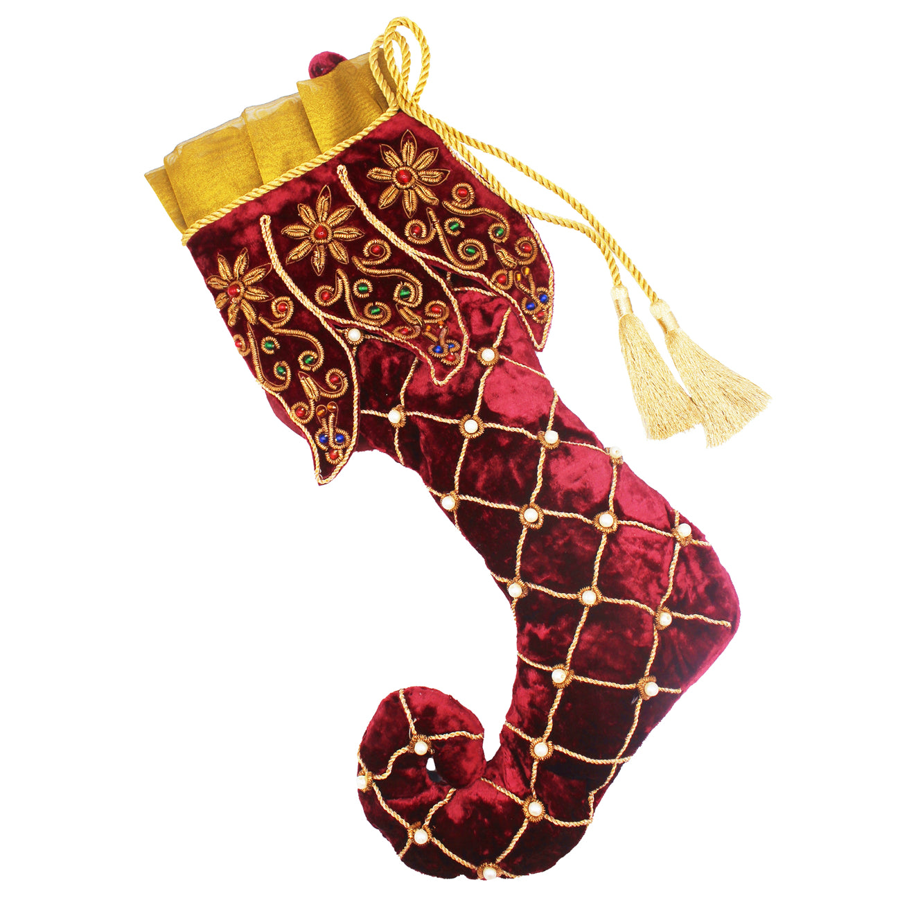La botte de Noël est un symbole de la magie et de la générosité de Noël. Elle permet aux enfants de rêver et d’espérer des surprises le matin du 25 décembre. C'est un élément qui contribue à faire de Noël une fête merveilleuse. Découvrez ici une belle version de cette fameuse botte. Bordeaux et dorée, elle a été élaborée à la main. Elle est ornée de perles et de broderies et peut facilement être suspendue grâce à un cordon doré.