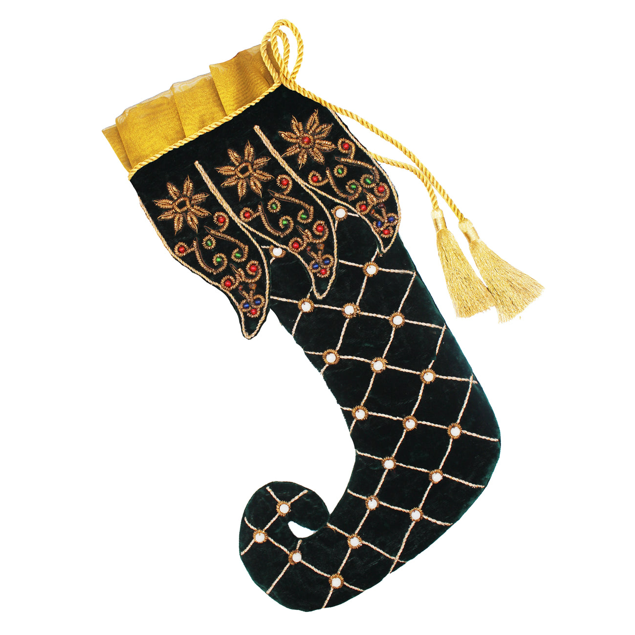 La botte de Noël est un symbole de la magie et de la générosité de Noël. Elle permet aux enfants de rêver et d’espérer des surprises le matin du 25 décembre. C'est un élément qui contribue à faire de Noël une fête merveilleuse. Découvrez ici une belle version de cette fameuse botte. Verte et dorée, elle a été élaborée à la main. Elle est ornée de perles et de broderies et peut facilement être suspendue grâce à un cordon doré.