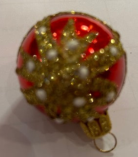 Utilisation : décoration à suspendre Dimensions : h. 5 cm Couleur(s) principale(s) : rouge et doré Matière(s) : verre soufflé Référence : 33717