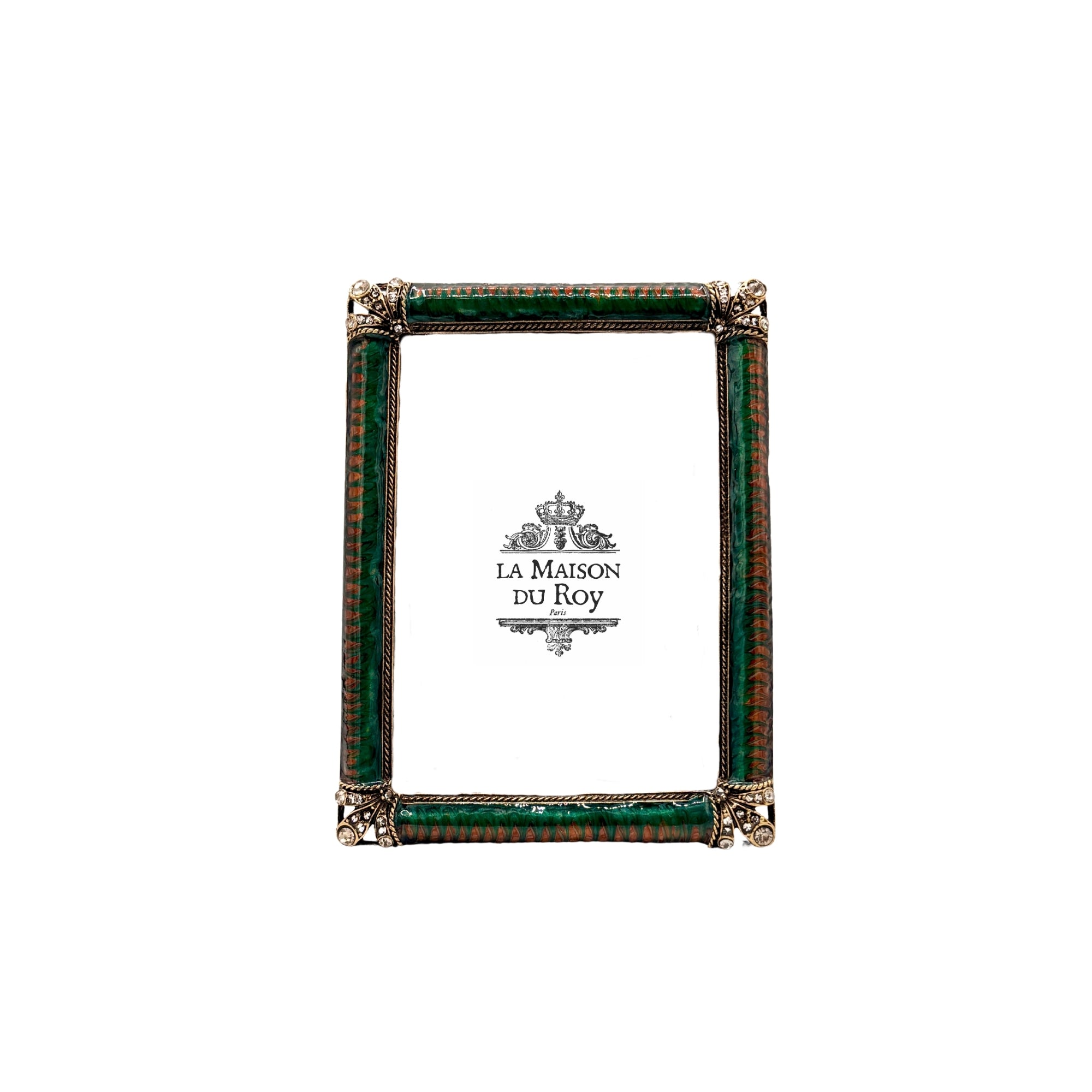 Le pourtour présente un émail vert nuancé, rythmé par un motif discret aux accents chauds. Aux angles, des volutes dorées encadrent de petits strass qui captent la lumière avec retenue. Un fin liseré torsadé marque la séparation entre la photo et l'encadrement, renforçant l'effet de relief.