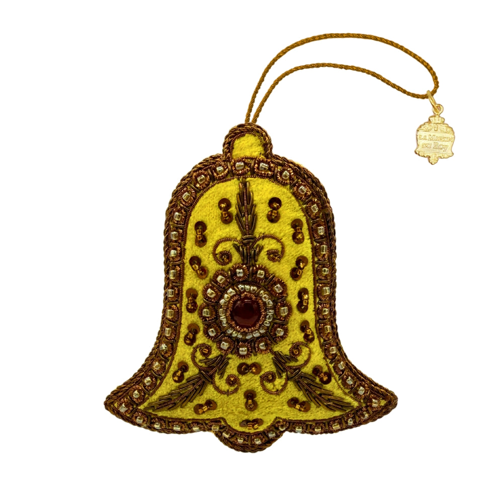 Cette cloche brodée main affiche une silhouette harmonieuse recouverte d’un velours jaune pâle mis en valeur par un fil doré appliqué avec précision, tandis que des motifs symétriques composés de paillettes et de perles subtilement disposées forment un ensemble ornemental qui rappelle la magie des fêtes et la convivialité.