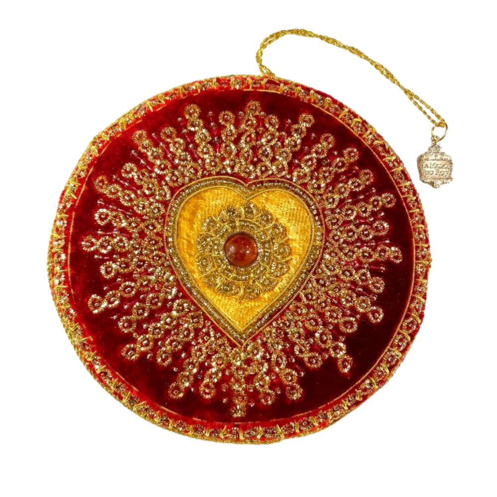 Création de La Maison du Roy – Ex-voto brodé à la main – ornement à suspendre – rouge et doré – 13 cm