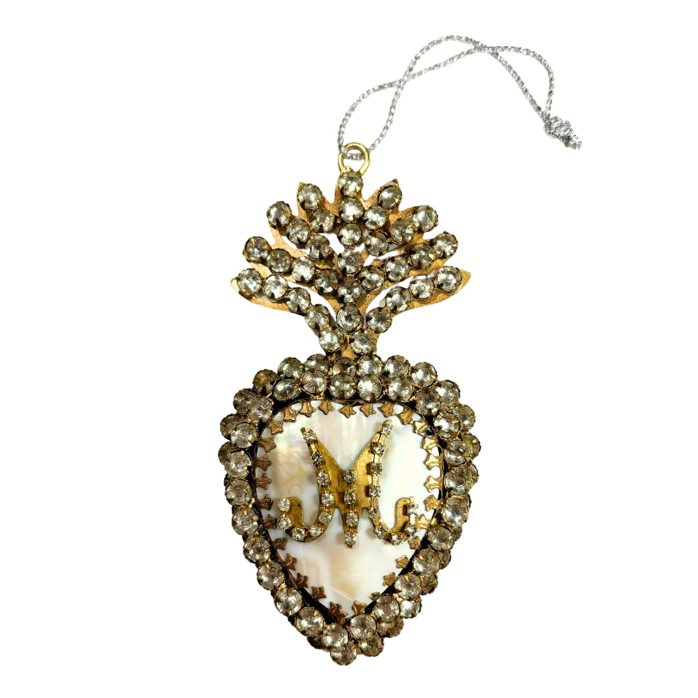 Au centre du médaillon en nacre, la lettre M est finement incrustée et rehaussée de détails dorés, ajoutant une touche personnelle et précieuse à cet ex-voto. La nacre, avec ses reflets irisés, contraste subtilement avec l'éclat des strass, offrant une harmonie visuelle captivante.