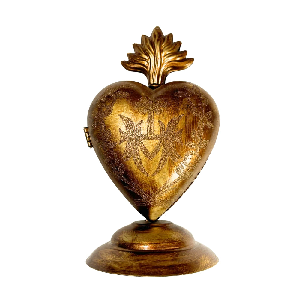 Surmonté d'une flamme sculptée, cet ex-voto évoque la spiritualité et la passion, éléments souvent associés aux offrandes votives. Le cœur repose sur un socle solide, le rendant facile à exposer sur une table, un autel ou une étagère, et lui donnant une présence imposante malgré sa simplicité.