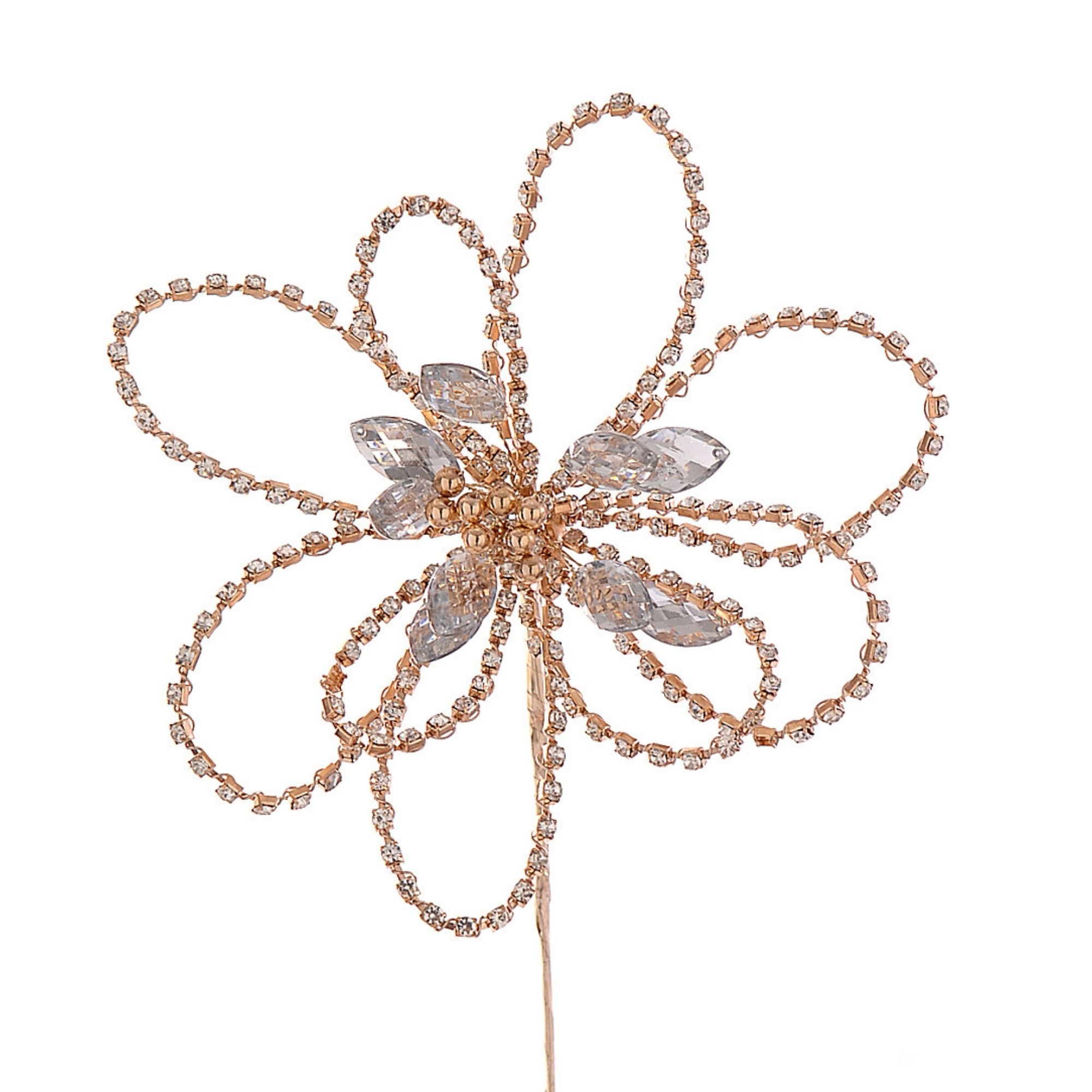 Fleur décorative de Noël réalisée en structure métallique dorée et ornée de strass scintillants. Ses pétales sont formés de boucles élégantes incrustées de petites strass, tandis que le cœur de la fleur est illuminé par de cabochons façon cristaux facettés qui reflètent magnifiquement la lumière. Légère et raffinée, cette fleur peut être insérée dans un sapin, une couronne ou un centre de table pour apporter éclat et sophistication. Elle se marie parfaitement avec des décorations dorées, argentées ou transparentes pour un effet lumineux harmonieux.