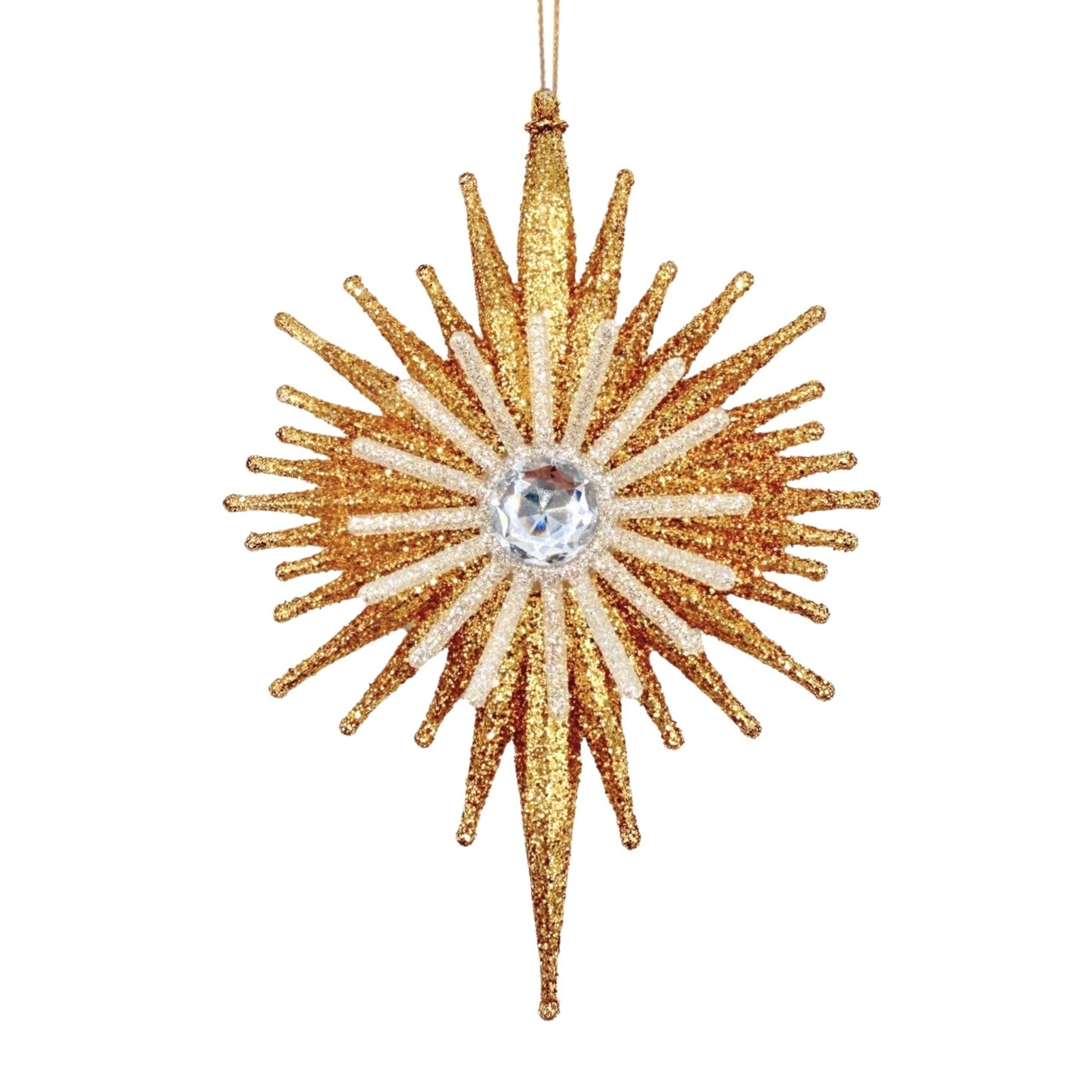 Cette décoration représente un classique de Noël : l'étoile polaire scintillante. C'est un beau sujet rappelant l'hiver qui apporte de la douceur et du réconfort à votre sapin. Ses branches recouvertes de paillettes dorées et argentées captent la lumière et diffusent de subtils reflets scintillants. Au centre, un strass transparent façon cristal intensifie l’éclat et crée un effet raffiné qui se marie parfaitement aux décorations traditionnelles ou contemporaines. Grâce à son cordon doré, cet ornement est facile à accrocher et s'accorde facilement à tous les décors. Sa matière résistante assure sa longévité pour les nombreux Noël à venir !