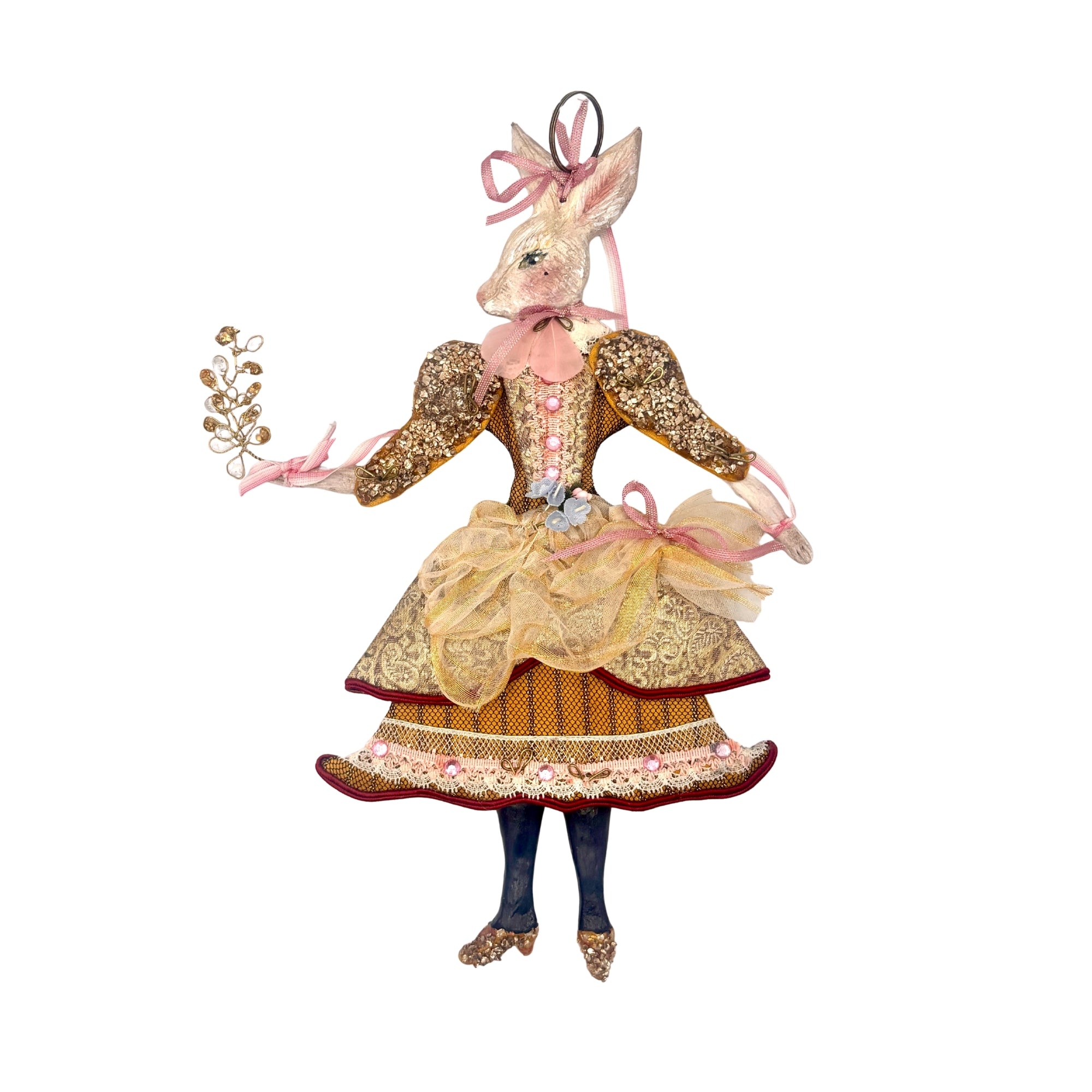 Lapin articulé réalisé en France, cette figure de lapine faite main s'inscrit dans l'esprit des décors de Pâques travaillés avec précision. Son corps articulé permet de varier les postures et d'animer la silhouette selon la mise en scène choisie. Elle porte une tenue élaborée et tient un délicat rameau doré.