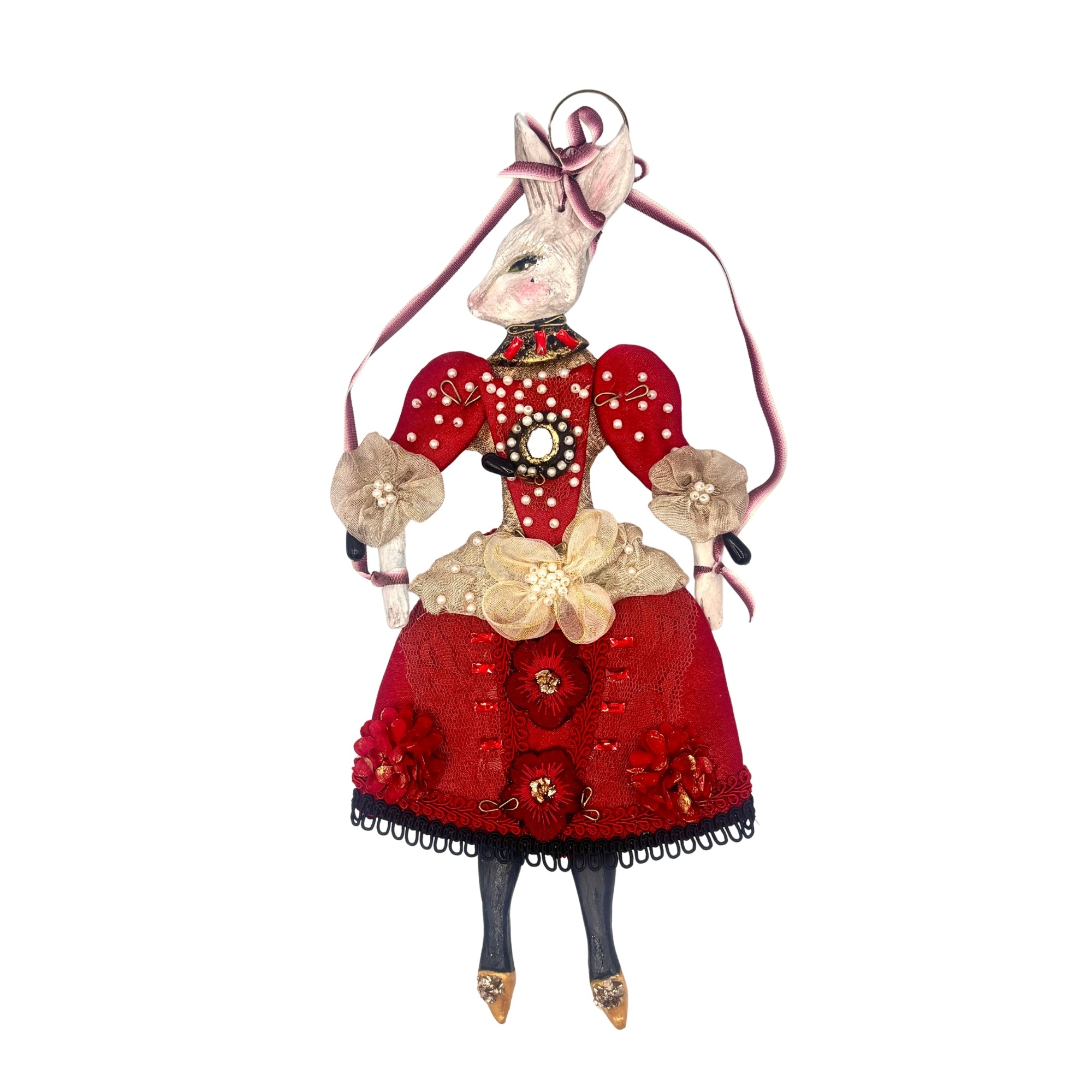 Lapin articulé issu d'une création d'artiste faite main en France, cette figure de lapine s'inscrit dans l'esprit de Pâques avec une allure habillée et théâtrale. Le corps articulé permet de varier les positions des bras et des jambes, donnant vie à la silhouette. Le visage finement peint et le port de tête incliné soulignent son caractère expressif.