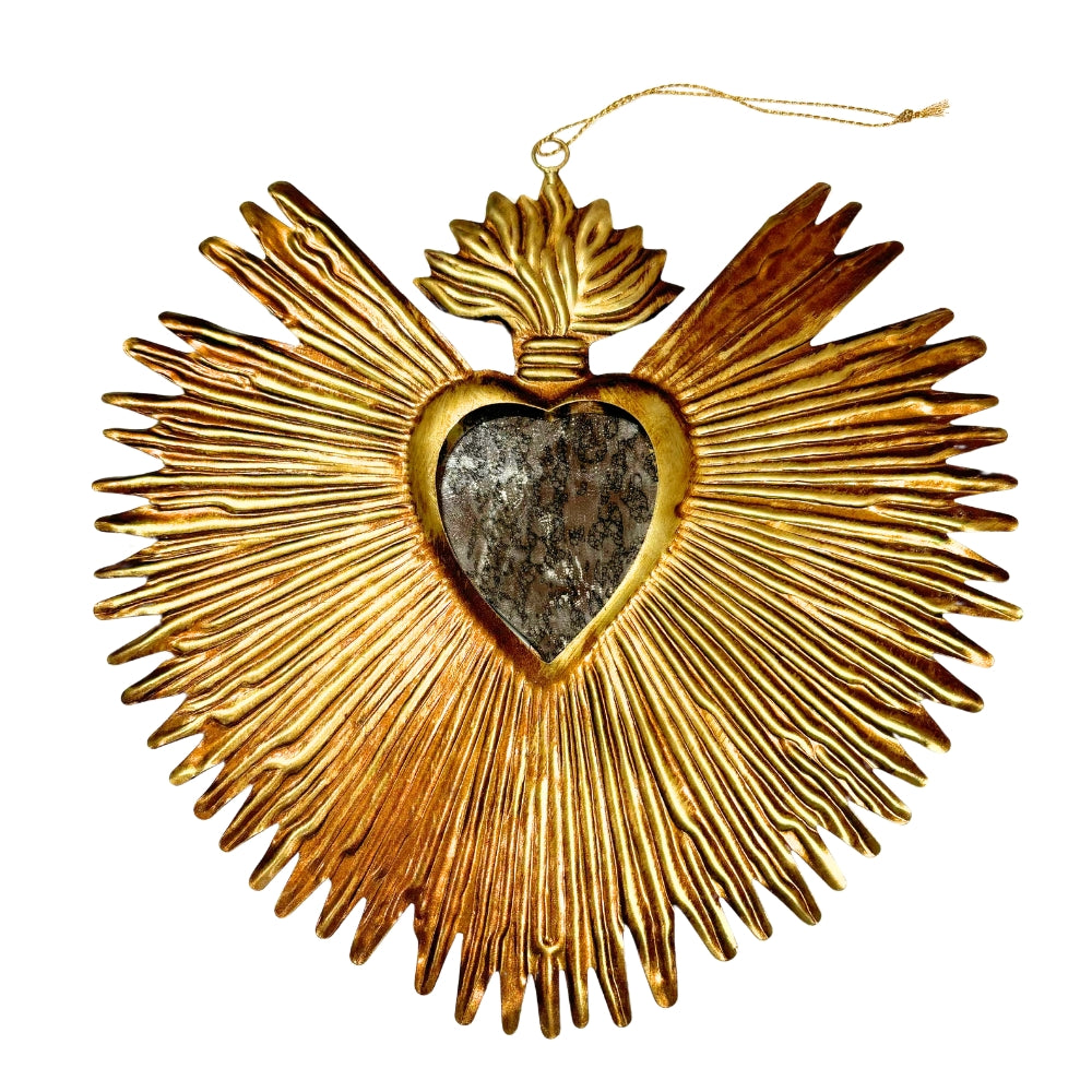 Ce magnifique Ex-Voto en métal doré est une représentation éclatante du cœur sacré entouré de rayons lumineux, symbolisant à la fois la foi, la dévotion et la lumière divine. Le centre de l'ornement présente un cœur sacré au contour lisse, avec un intérieur texturé, probablement en métal patiné ou gravé, apportant un contraste visuel captivant entre le cœur et ses rayons dorés.