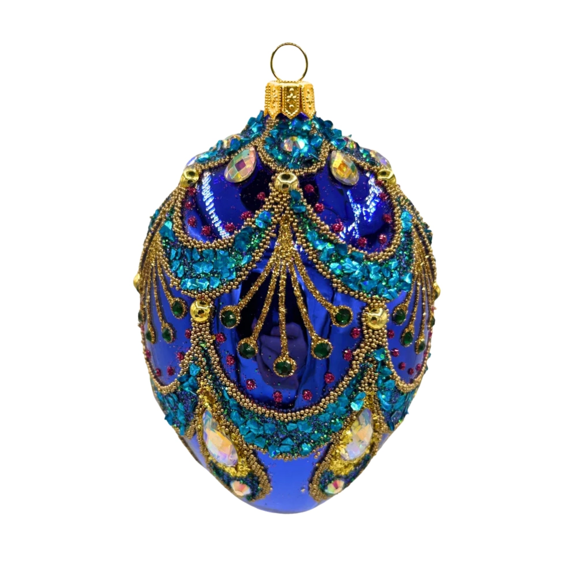 Cet œuf de Noël en verre soufflé est une création artisanale élégante, réalisée à la main par des artisans polonais. Avec ses couleurs éclatantes, cet ornement de 12 cm se distingue par son fond bleu profond rehaussé de riches décorations dorées, agrémentées de motifs violets et de détails en paillettes bleues. Les pierres colorées et les perles dorées qui ornent l'œuf créent un effet spectaculaire, rappelant des drapés luxueux, et ajoutent une dimension festive à votre sapin. Cette décoration est idéale pour ceux qui souhaitent enrichir leur arbre de Noël avec des pièces originales et raffinées.