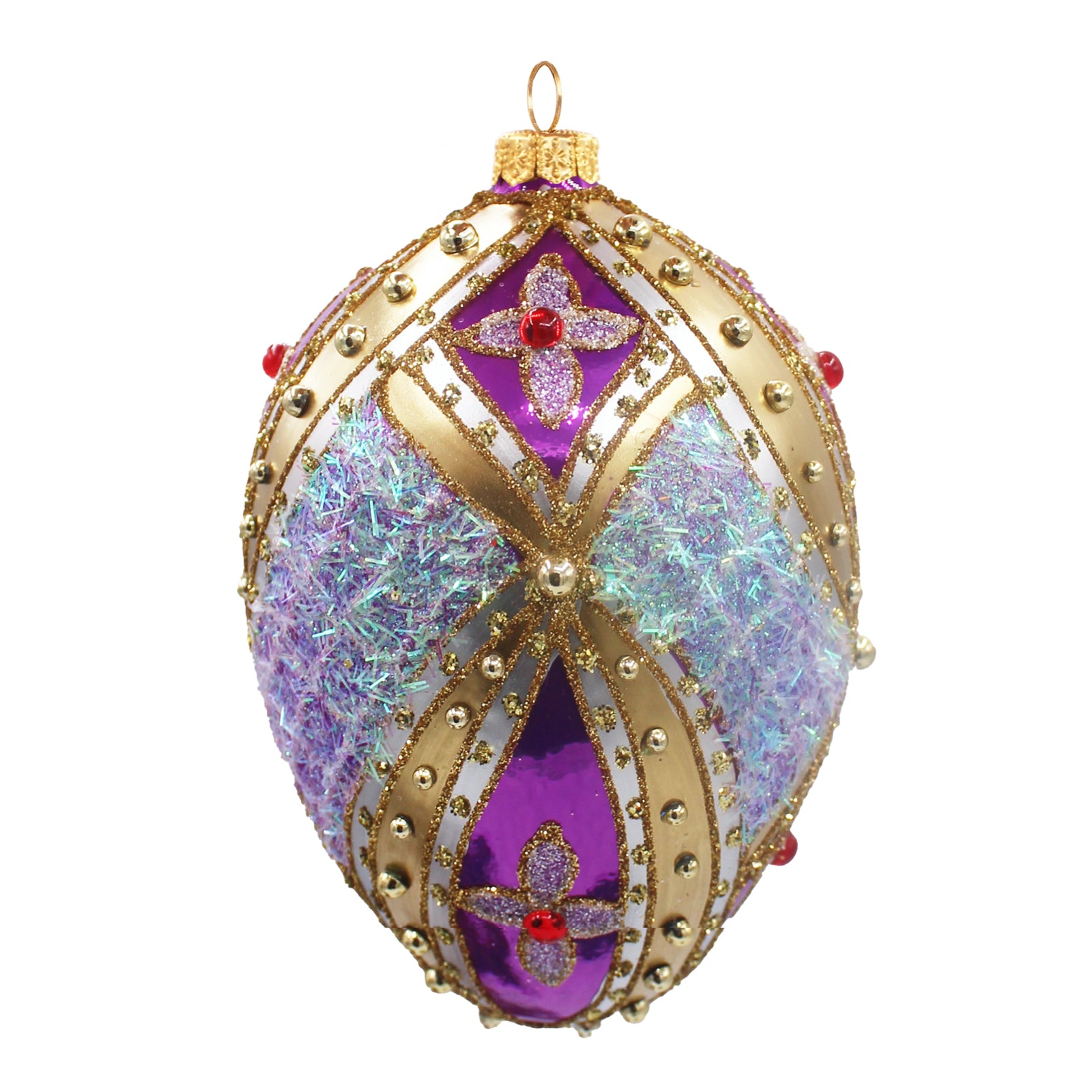 Œuf en verre soufflé avec effet holographique – décoration de Noël en verre soufflé – violet et doré – 12 cm