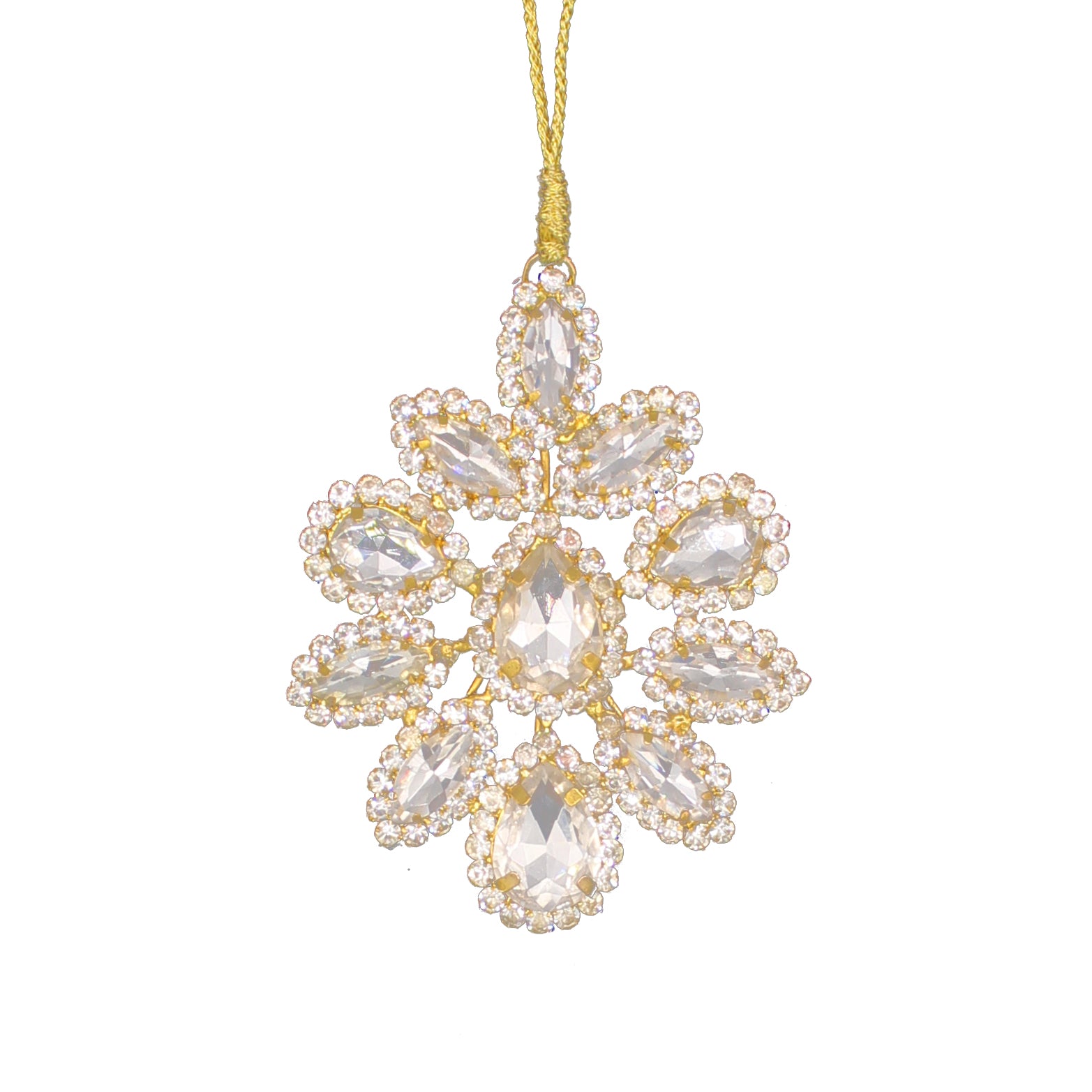 Cette suspension délicate, formant un motif de fleur, est pleine de fantaisie. Elle se compose d'une armature de métal doré ciselé qui est chargée de cristaux synthétiques. Ces cristaux facettés reflètent la lumière et créent des reflets scintillants, qui raviront les amateurs de jeux de lumière. Elle apporte une touche d’élégance et de raffinement à votre décoration de Noël. Elle se marie parfaitement avec les couleurs chaudes et les matières nobles, comme le velours ou le satin. C’est une pièce qui fera sensation auprès de vos invités.