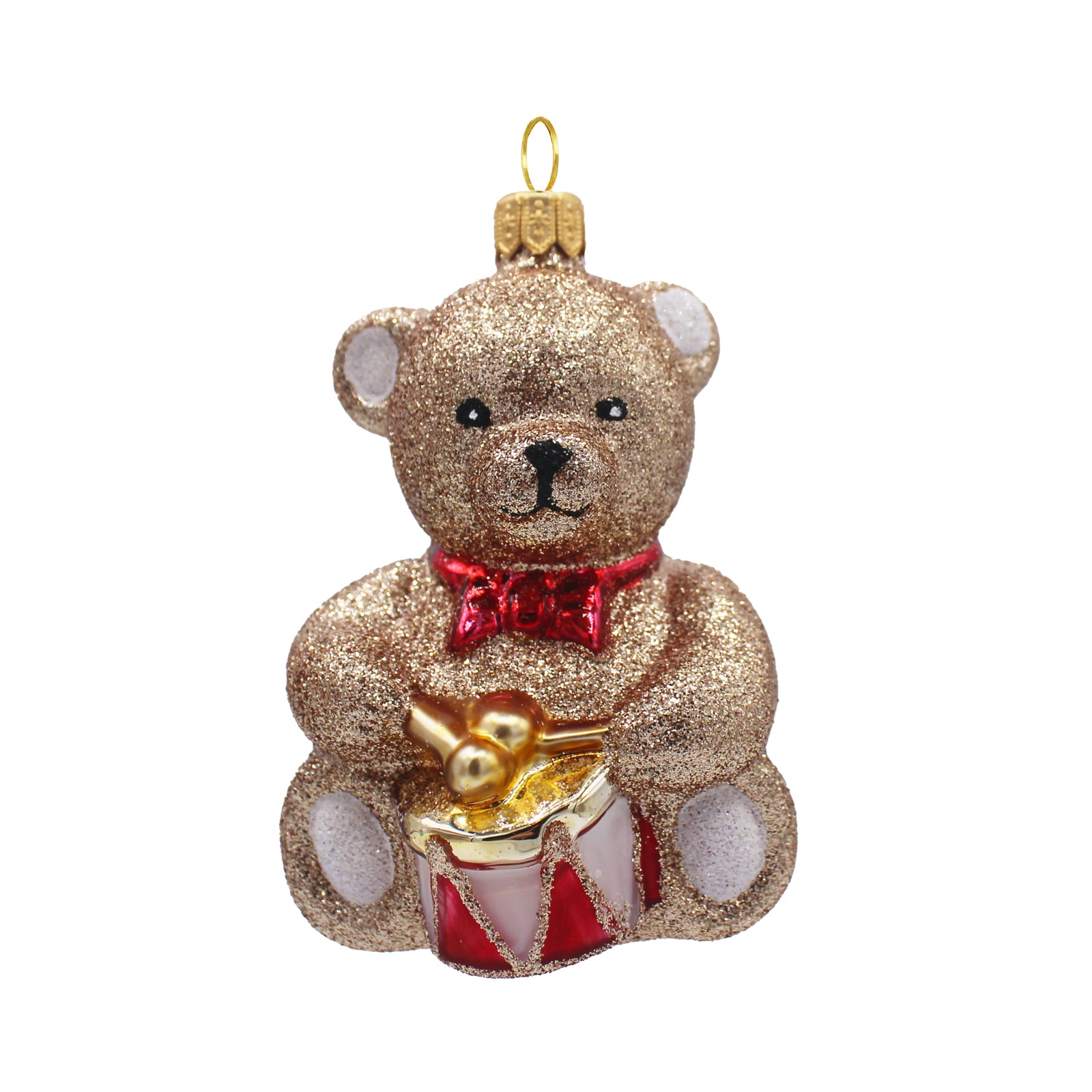 Ourson jouant du tambour en verre soufflé – décoration de Noël à suspendre – rouge et brun – 9 cm