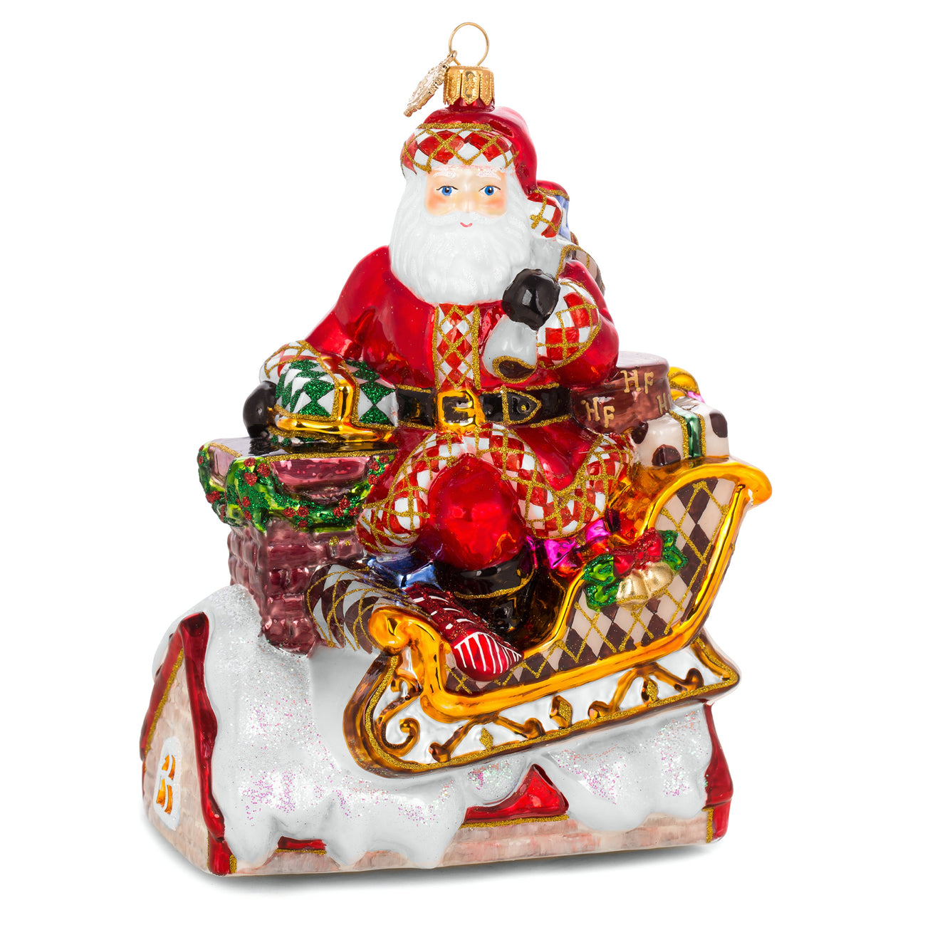 Ce magnifique ornement en verre soufflé représente le Père Noël installé confortablement sur le toit enneigé d'une maison, prêt à descendre par la cheminée avec son traîneau rempli de cadeaux. Chaque détail, du motif arlequin sur sa tenue à la peinture minutieuse des cadeaux, évoque l'esprit festif de Noël. En édition limitée, cet ornement unique est parfait pour embellir votre sapin ou compléter une collection de décorations de Noël traditionnelles.