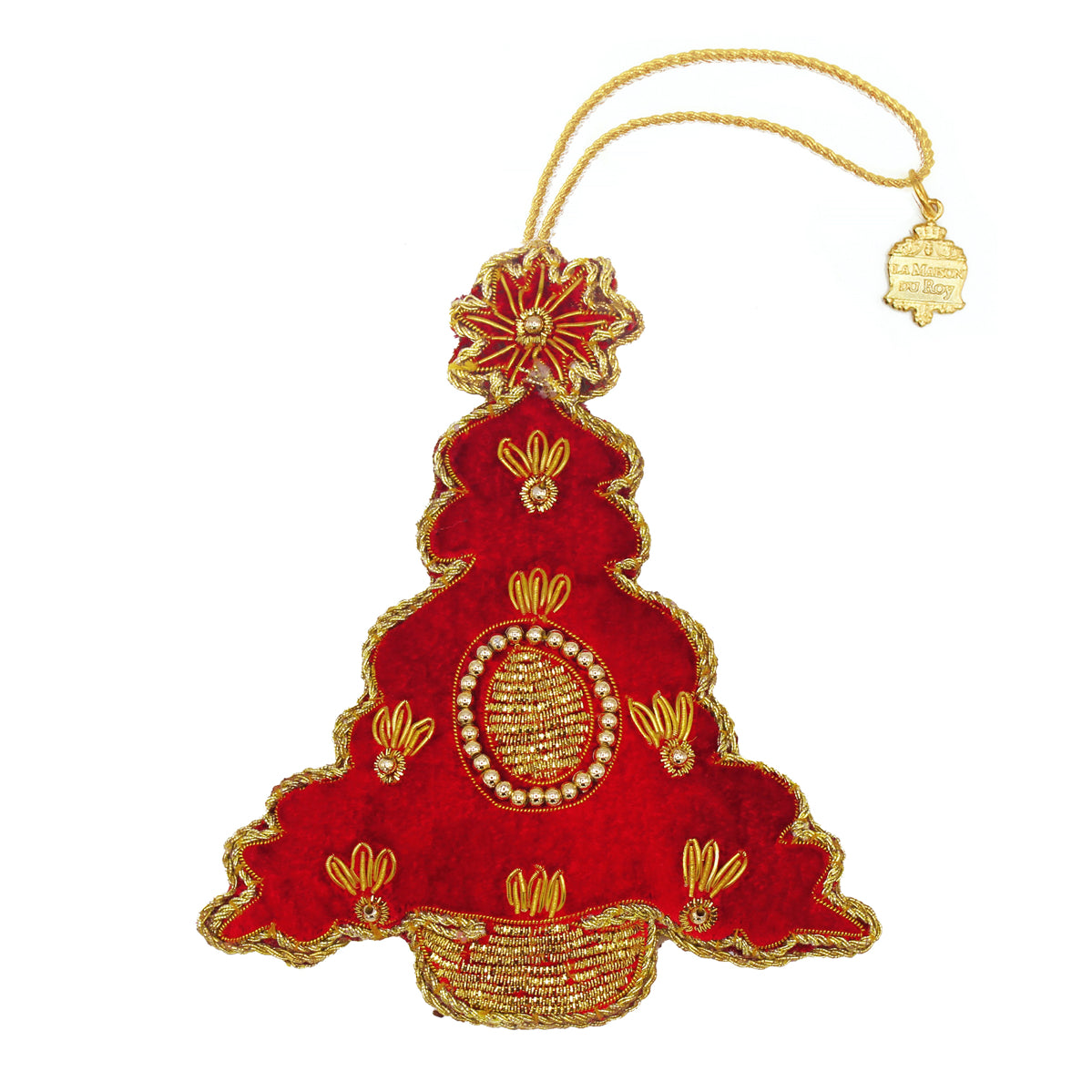 Création de La Maison du Roy – Sapin brodé à la main – décoration à suspendre – rouge et doré – 14 cm