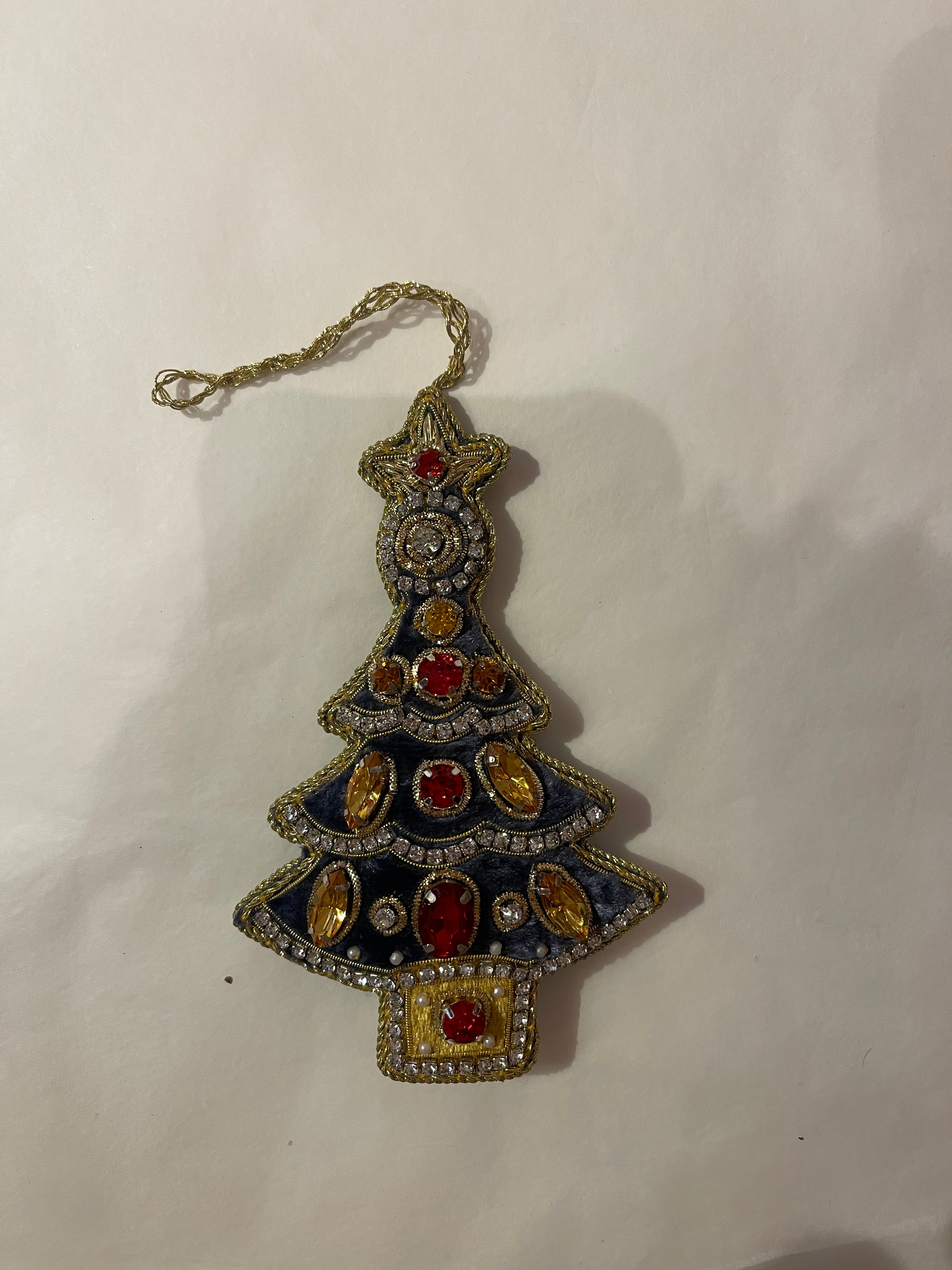 Sapin de Noel brodé à la main en velours bleu, perlé et strassé