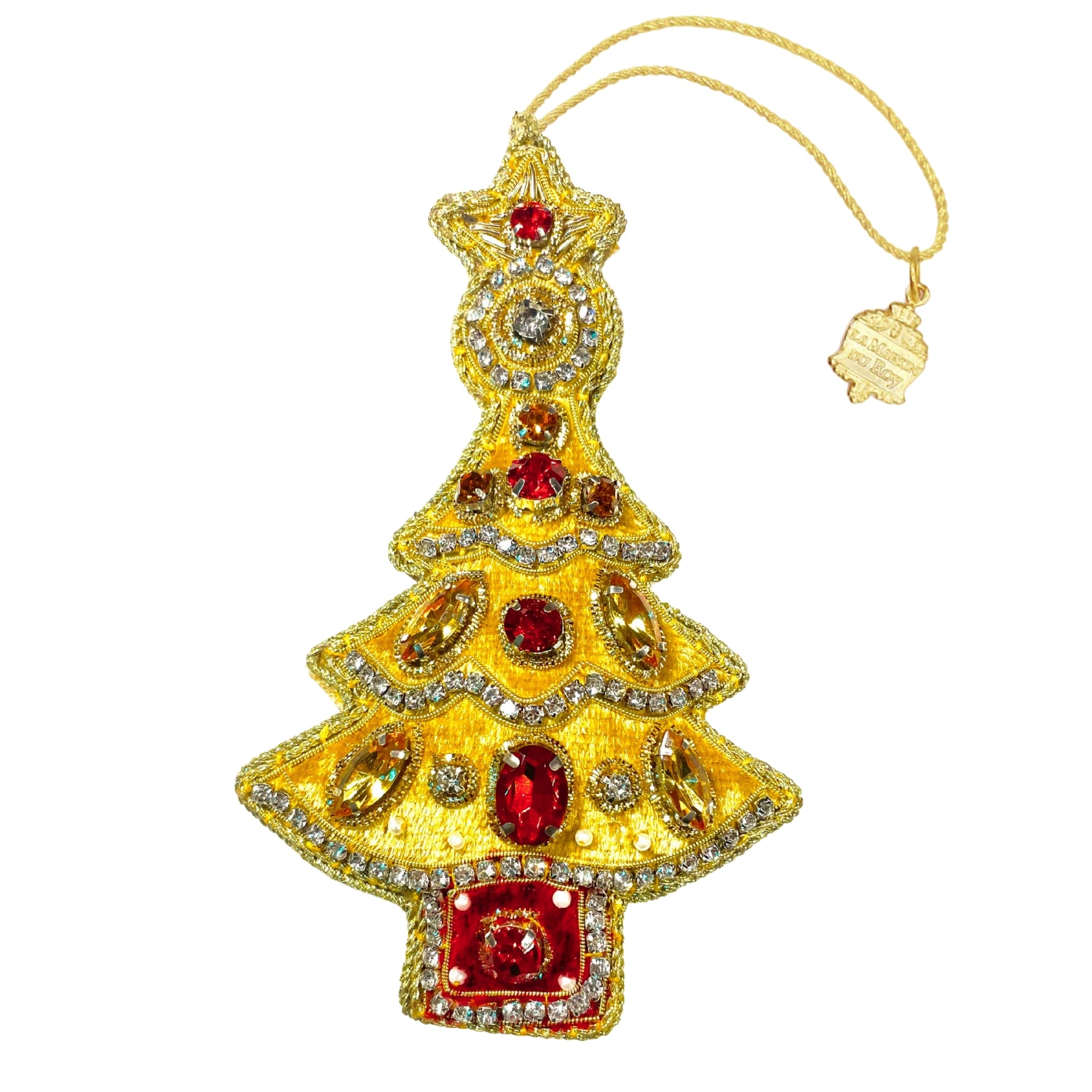 Petit sapin de Noël brodé à la main en velours doré, perlé et strass