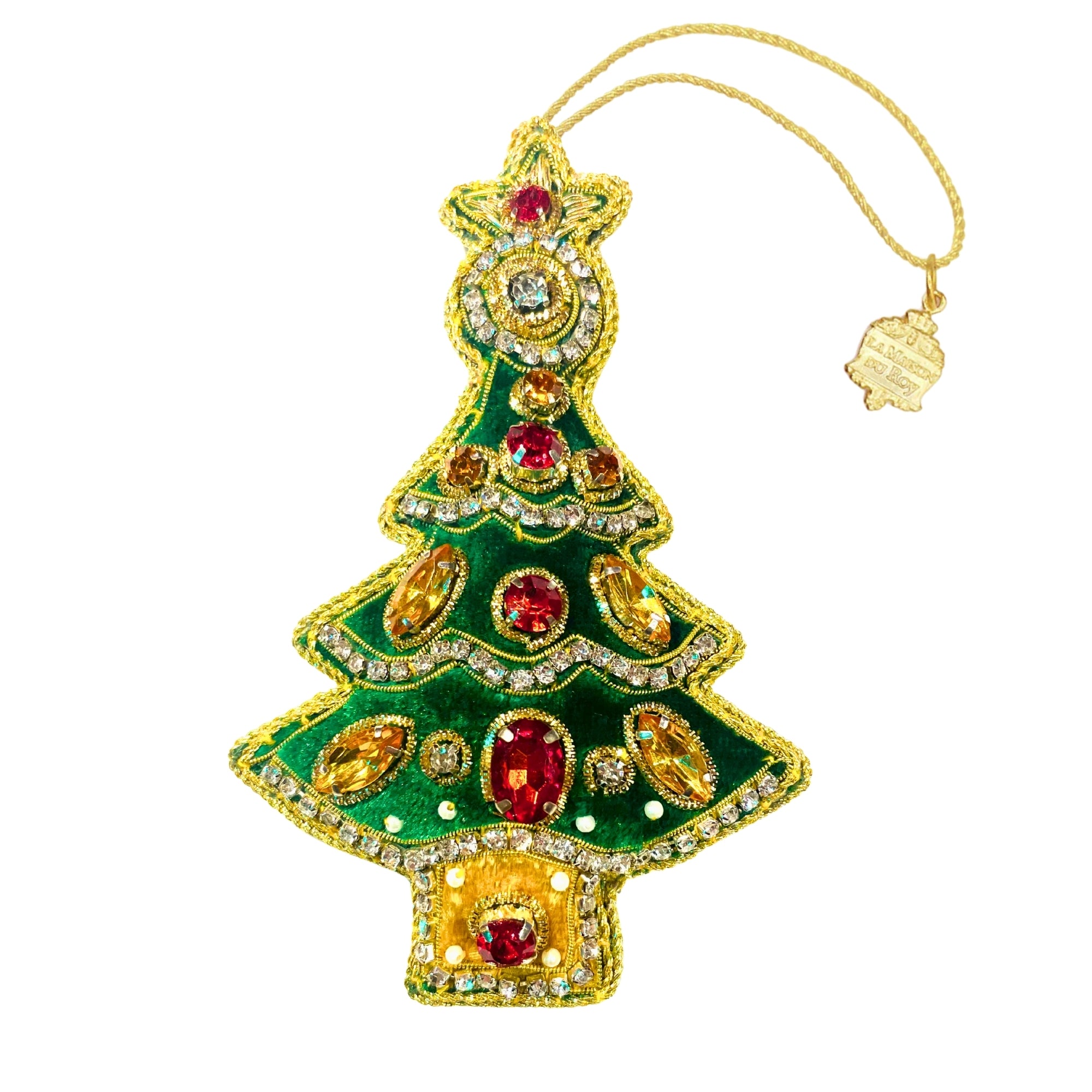 Petit sapin de Noël brodé à la main en velours vert, perlé et strass