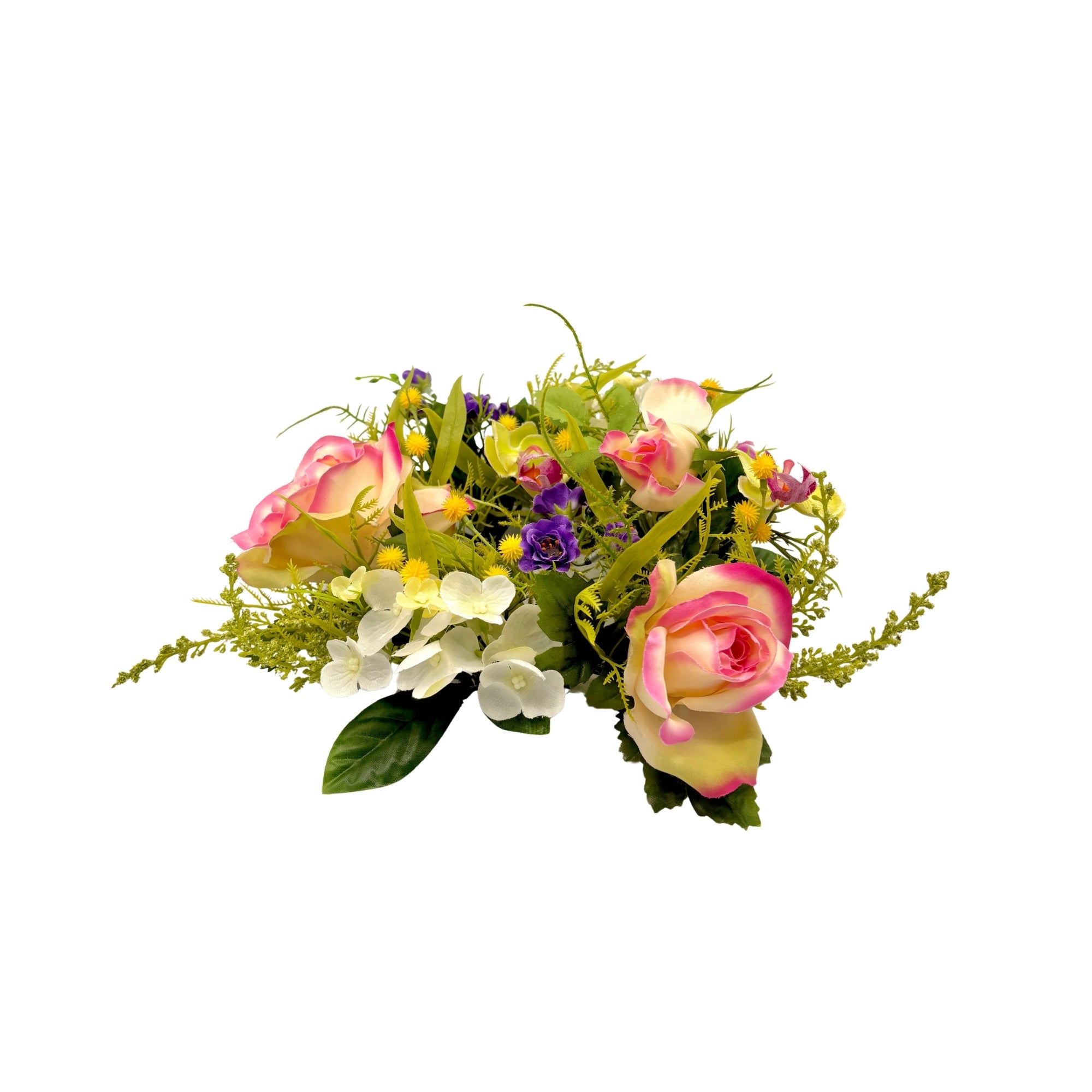 La composition associe de grandes fleurs aux pétales rose dégradé et ivoire à de petites fleurs blanches et violettes. Des touches de jaune ponctuent l'ensemble et dynamisent la palette, tandis que le feuillage vert, finement découpé, apporte profondeur et contraste. Les volumes alternent fleurs ouvertes et éléments plus compacts pour un rendu naturel et structuré.