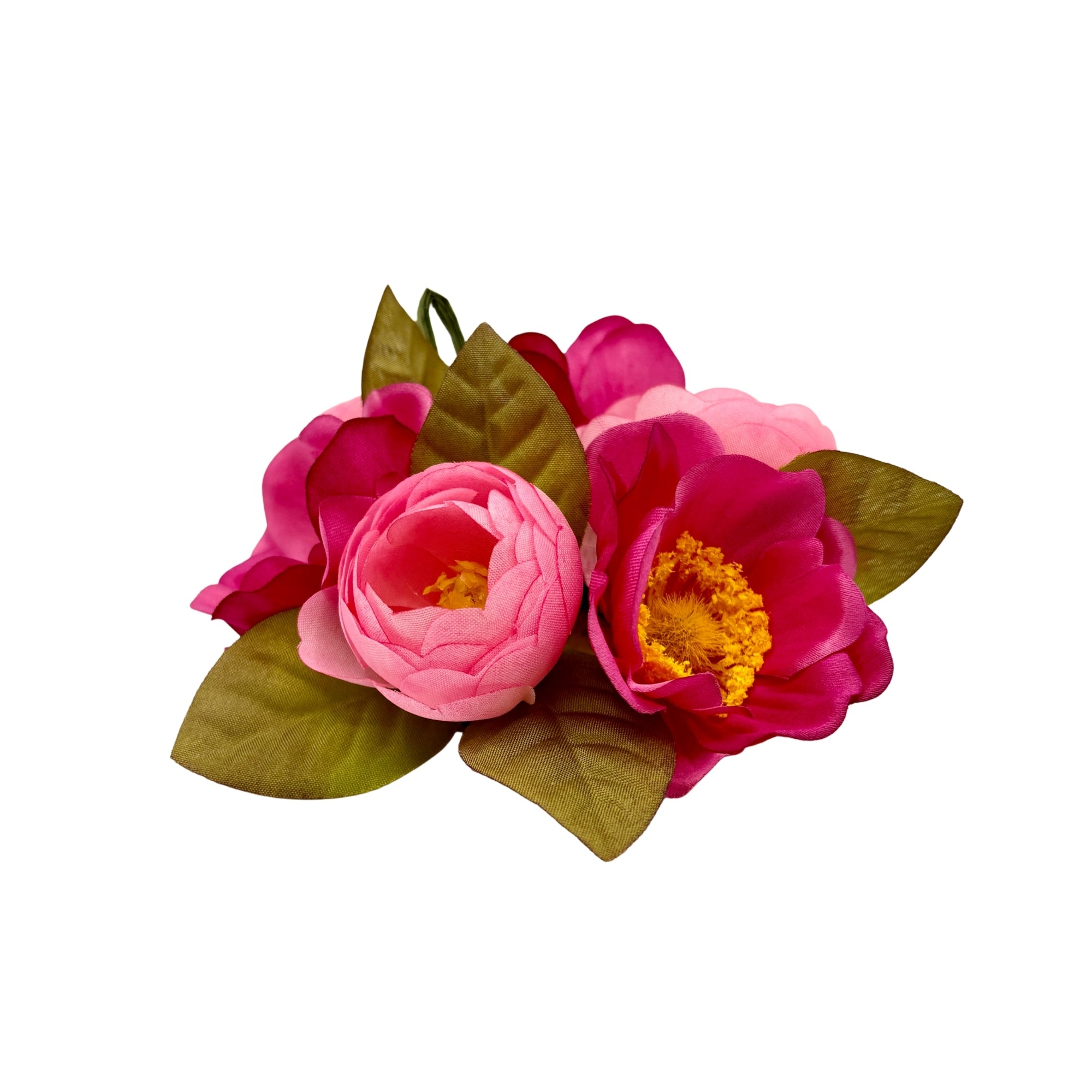 Les fleurs présentent des volumes généreux, travaillés dans un textile à l'aspect soyeux. Les pétales arrondis de la renoncule répondent à l'anémone ouverte, dont le centre texturé apporte relief et profondeur. Des feuilles vertes structurent la base et soulignent les tonalités florales pour un équilibre visuel marqué.