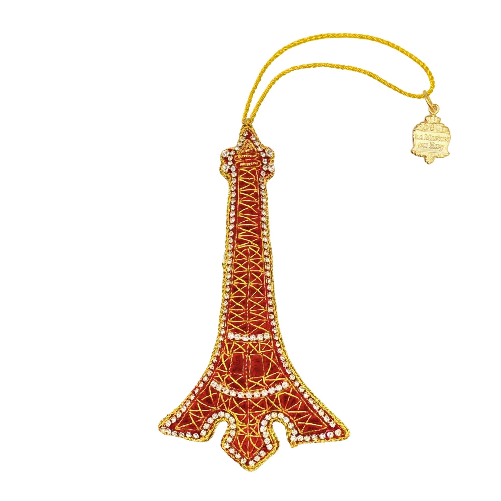 Un galon torsadé or souligne le pourtour de la silhouette, tandis qu’une rangée de petits strass transparents renforce son éclat sous la lumière. À la base, des points de broderie dorée esquissent les fondations de la tour. Le tout est relié à un cordon torsadé doré, orné d’une médaille « La Maison du Roy », gage d’authenticité et de qualité et permettant à l'ornement d'être aisément suspendu dans une décoration d'intérieur, sur un sapin de Noél ou une poignée de porte.