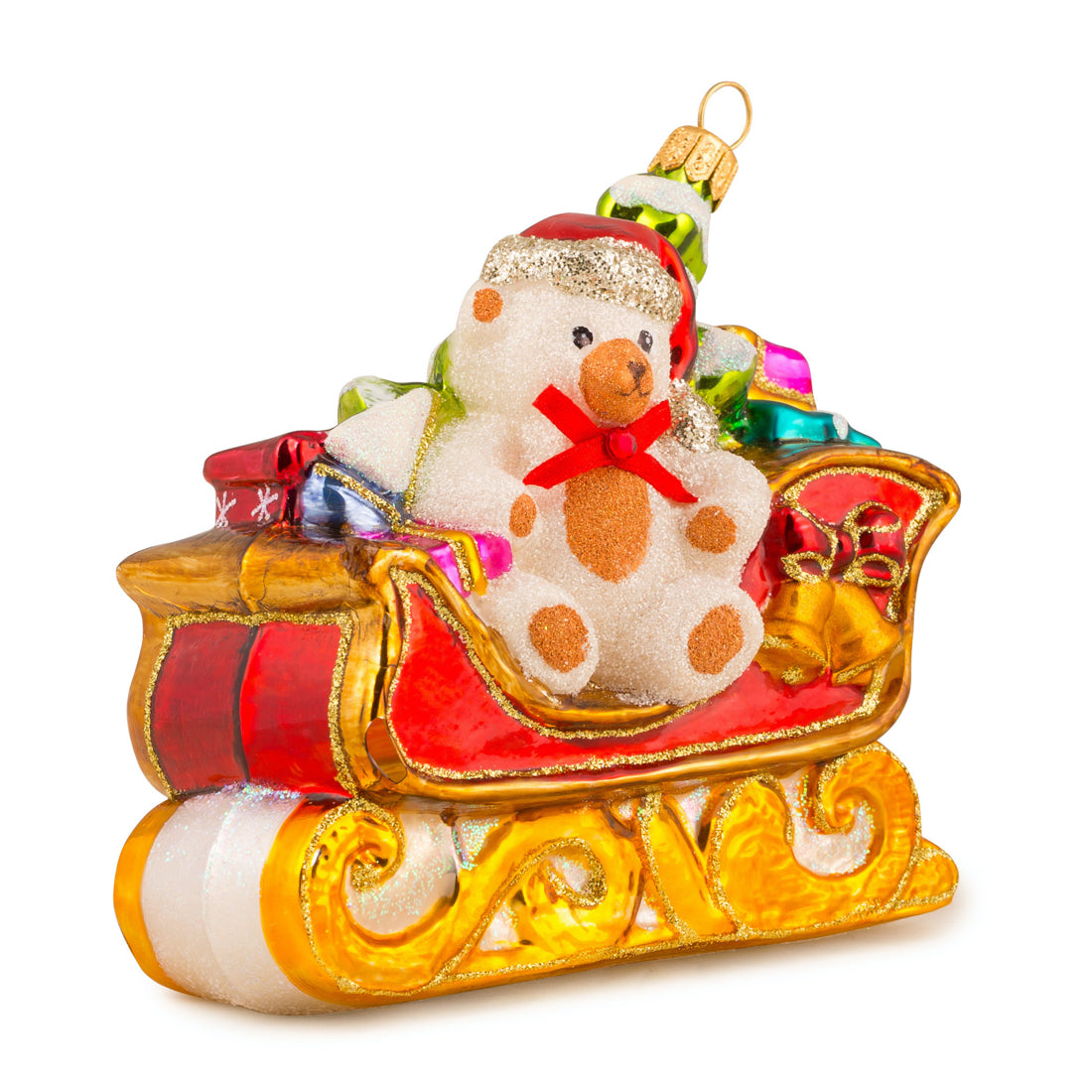 Création Huras Family – Traîneau chargé de cadeaux et d'un ours en peluche – décoration de sapin en verre soufflé – 12 cm
