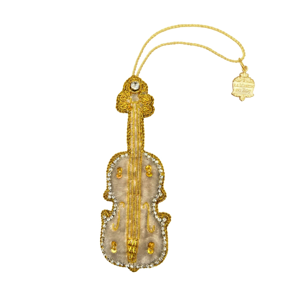 Violon brodé fond velours gris fils dorés et strass 14cm